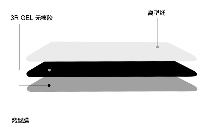 上圖雙面可移膠,由離型膜與3R GEL無痕可移膠組成,可做無基材與有基材兩種,上圖為無基材產品